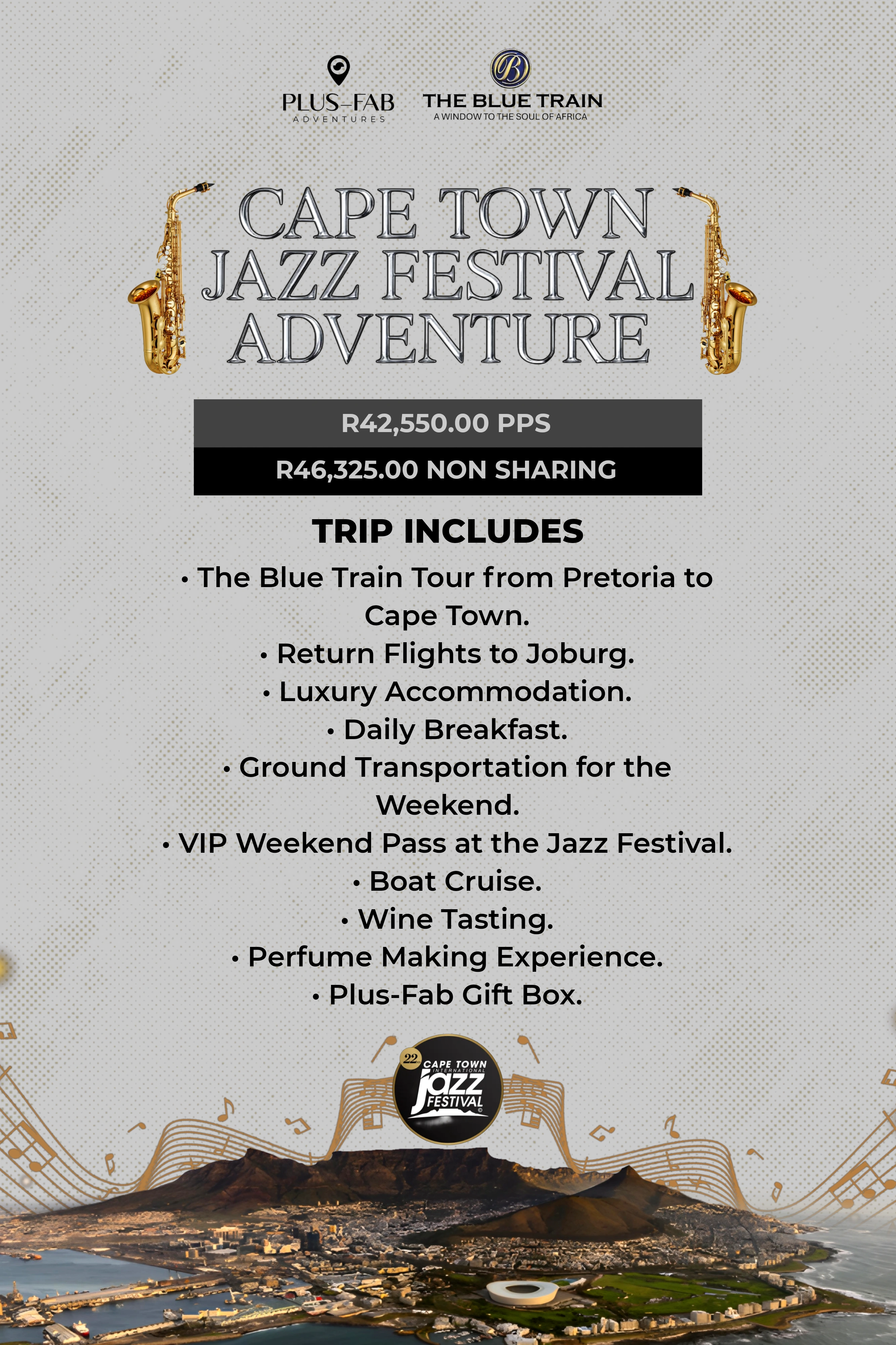 Join us for the Plus-Fab Adventure to the Cape Town Jazz Festival in collaboration with The Blue Train — an exclusive 3-day luxury rail experience followed by a 4-day curated Cape Town getaway designed for fabulous women who love style, entertainment, and culture.